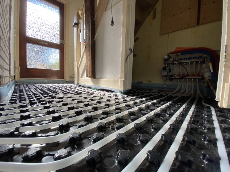 Over de vloerverwarming wordt een cementdekvloer gestort van 60 mm. Deze dekvloer heeft een snelle droogtijd van 14 dagen.